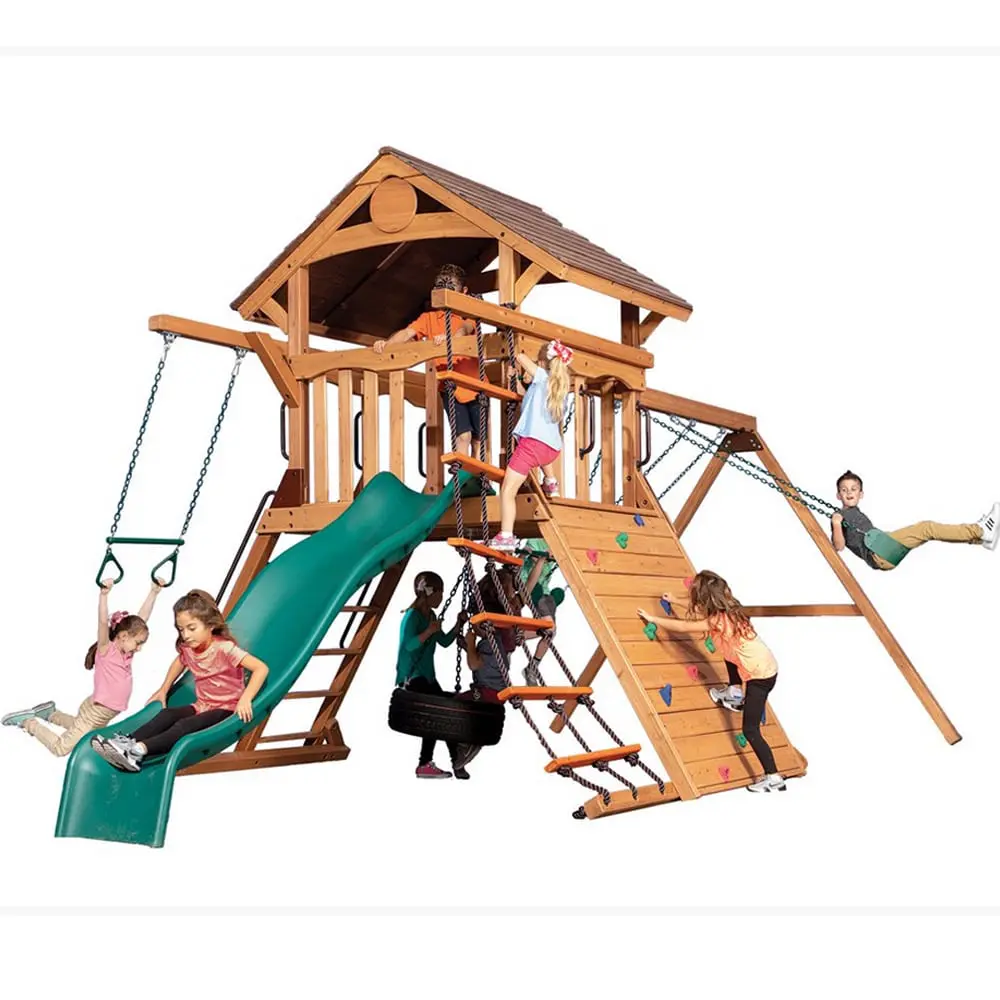 L’ensemble de balançoire Adventure Summit XL 1 a quelque chose que tous les enfants veulent et à un prix que maman et papa adorent. La structure du fort possède un pont de 5 pieds de haut avec plus de 25 pieds carrés d’espace de jeu. Cette structure de jeu comprend également un toit en bois XL, un kit de pignon, un bras accessoire avec échelle de corde, un bras accessoire avec barre trapèze, une poutre pivotante à 3 positions de 8′, des balançoires à 3 courroies et un toboggan ondulé à double paroi. Les ensembles de jeu Summit Outlook incluent une garantie à vie limitée sur tous les composants en bois, en métal et en quincaillerie.